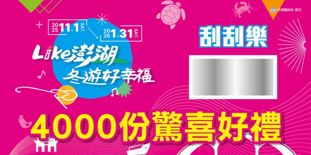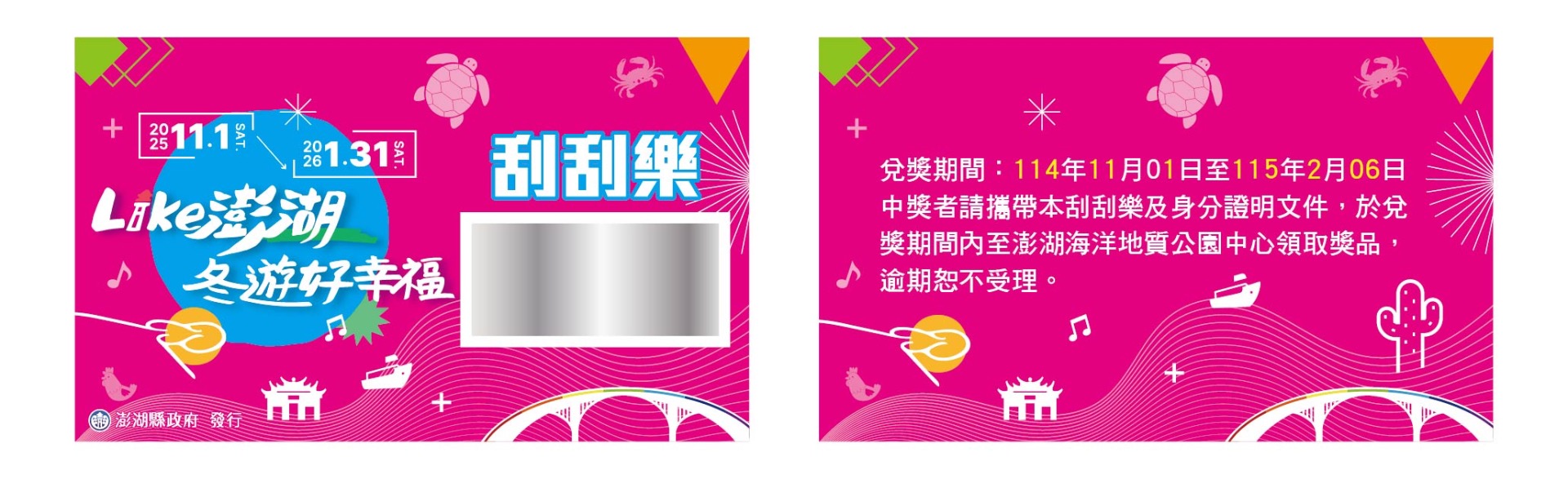 中獎者請攜帶刮刮樂及身分證明文件,至澎湖海洋地質公園中心兌換獎品。兌換期間:2025年11月1日至 2026年2月6日,逾期不受理。