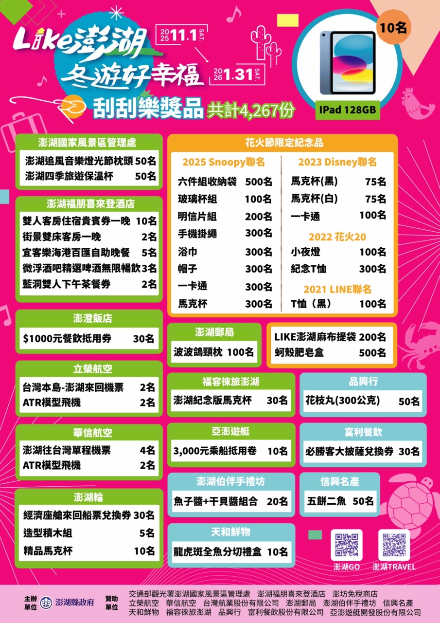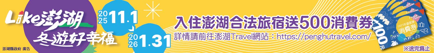 - 活動諮詢專線:06-9268543,相關資訊請參考澎湖 Travel 網站「2025 冬遊澎湖消費券」活動專區。
