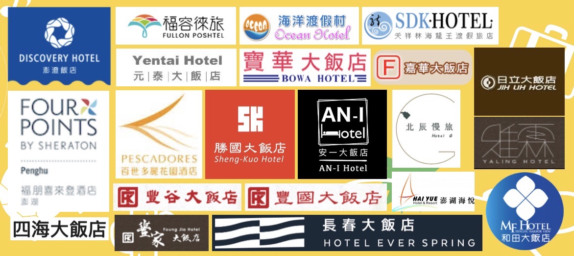 (四)特約代辦飯店:百世多麗花園酒店、澎澄飯店、澎湖福朋喜來登酒店、福容徠旅澎湖、勝國大飯店、長春大飯店、海洋渡假村、日立大飯店、天祥林海龍王渡假飯店、嘉華大飯店、安ㄧ大飯店、寶華大飯店、元泰大飯店、四海大飯店、雅霖大飯店、豐谷大飯店、豐家大飯店、豐國大飯店、北辰慢旅、和田大飯店、澎湖海悅飯店。(21家)