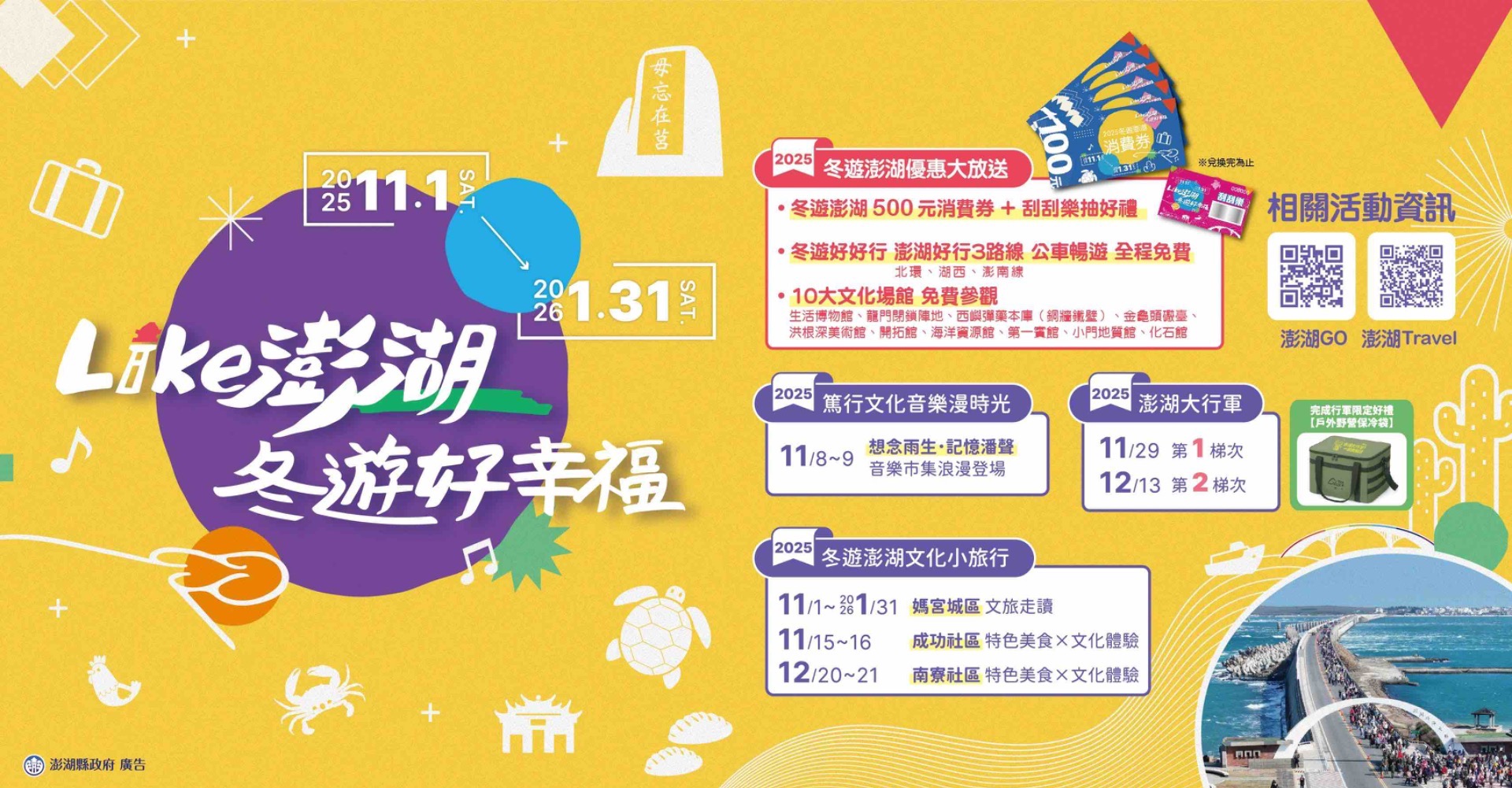 - 活動諮詢專線:06-9268543,相關資訊請參考澎湖 Travel 網站「2025 冬遊澎湖消費券」活動專區。