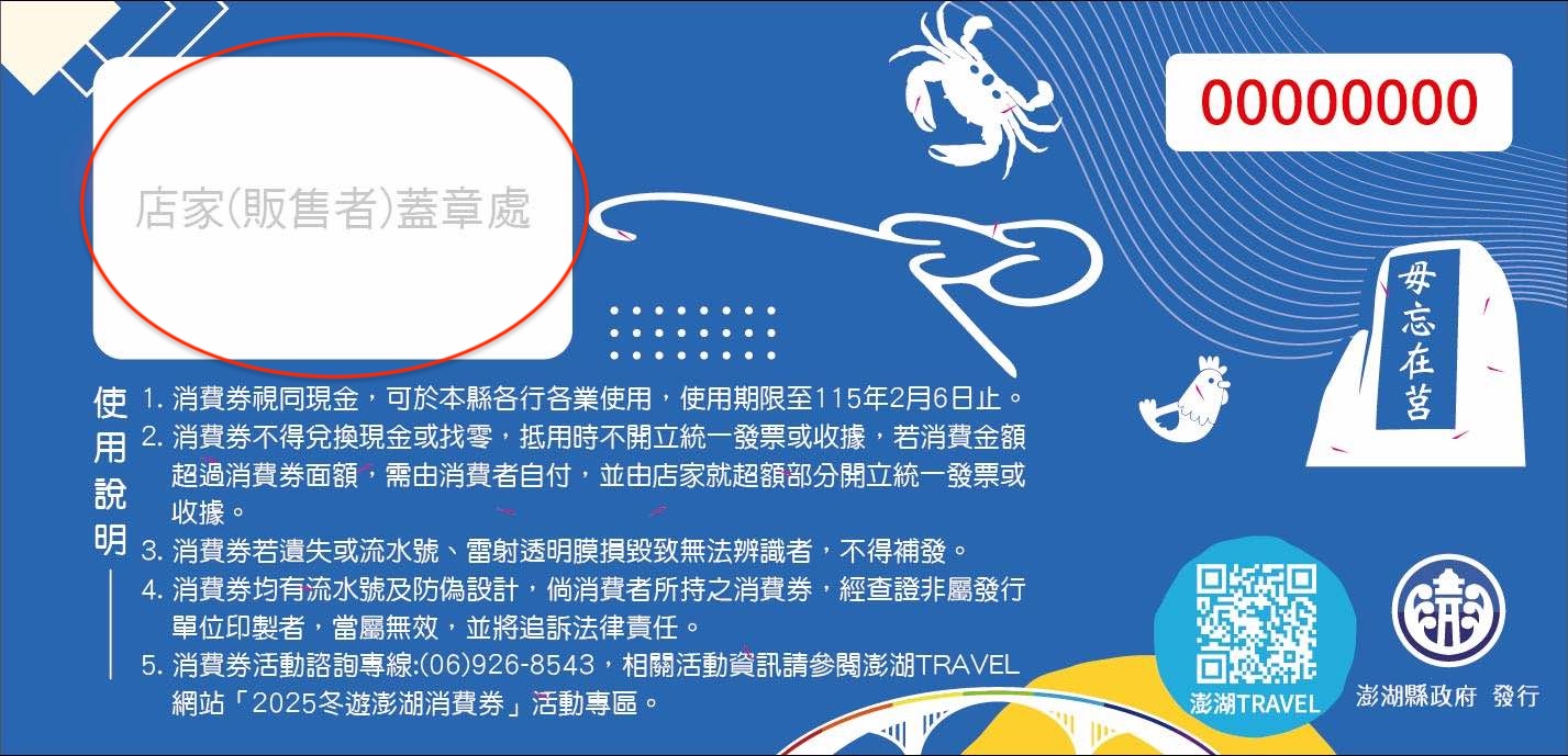業者於收取消費券後,活動期間可每日向澎湖海洋地質公園中心旅遊資訊站申請兌付。